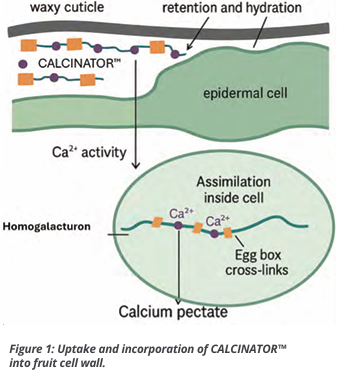 The uptake process of CALCINATOR™ begins with the deposition of droplets that adhere strongly to the fruit surface and remain hydrated for extended periods. Within these droplets, buffered Ca²⁺ complexes diffuse through polar cuticular pathways and microcracks. Once inside the epidermis and apoplast, translocation occurs primarily over short distances, as Ca remains largely immobile in the symplast and phloem (White, 2001).