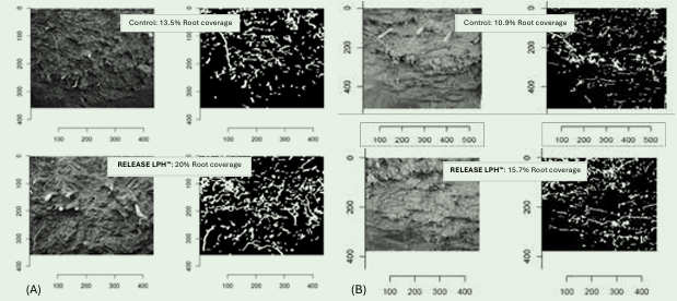 Figure 1. Percentage (%) root coverage after Release LPH™ application on (A) Table Grapes ‘Sweet Globe’ in clay soil, and (B) Lemon ‘Fino’ in loam-silt, 15 L/ha applied four times (60 L per season).