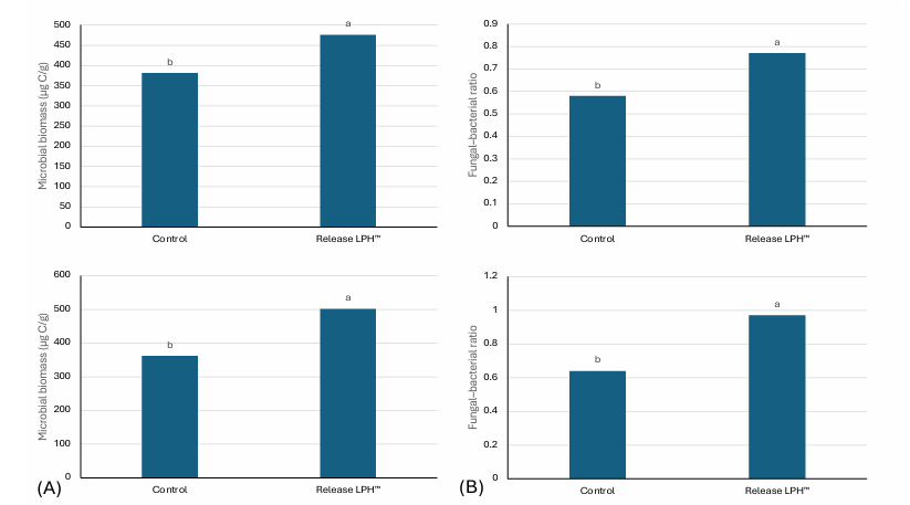 Figure 2: Microbial and fungi:bacteria ratio change after RELEASE LPH™ application on (A) Table Grapes ‘Sweet Globe’ in clay soil, and (B) Hazelnuts ‘TDG’ in clay loam soil, 15 L/ha applied four times (60 L per season). Treatment means differed significantly based on Duncan’s Multiple Range Test at the 5% significance level (p ≤ 0.05).