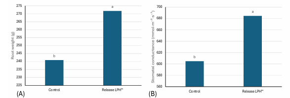 Figure 3: Physiological effects after Release LPH™ application on (A) root weight and (B) stomatal conductance on