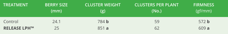 These improvements extended to yield performance and fruit quality. In ‘Autumn Crisp’ table grapes, RELEASE LPH™ increased berry diameter, cluster weight, clusters per plant and fruit firmness relative to untreated controls (Table 1).