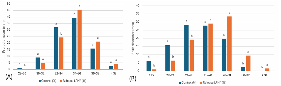 Figure 6: Fruit size of (A) Walnut ‘Chandler’ and (B) Cherries ‘Regina’ after 15 L/ha RELEASE LPH™ applied four